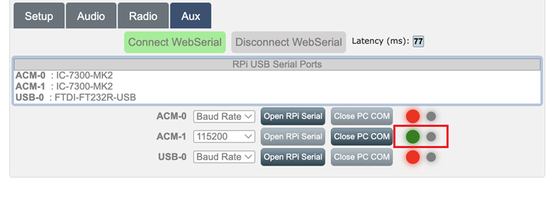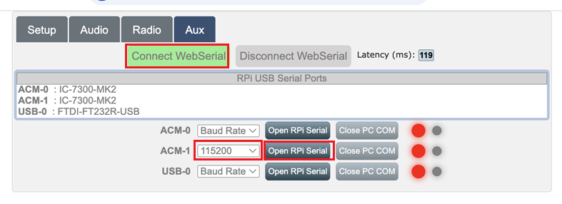 - Click on the Aux tab and click on Connect WebSerial green button. Then, select the ACM-1 port, set it to 15200 baud and click Open RPi Serial.