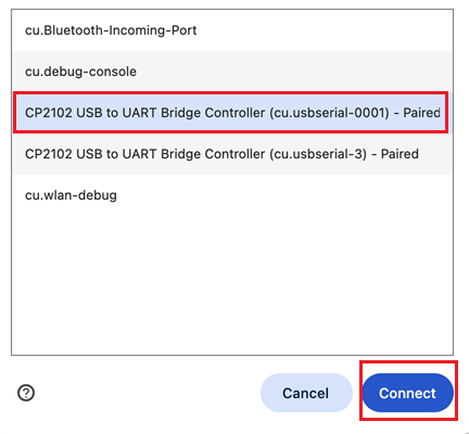 - Choose the cu.usbserial-0001 port and click Connect.