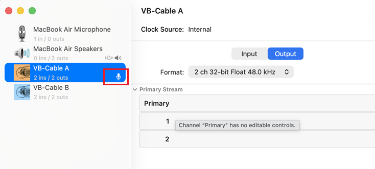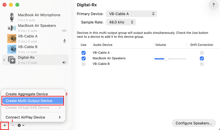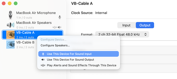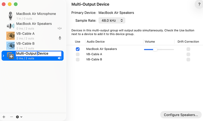 Once you have Renamed it, on the right panel, under the Use column, check both VB-Cable B and MacBook Air Speakers.