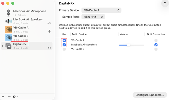 Once you have Renamed it, on the right panel, under the Use column, check both VB-Cable A and MacBook Air Speakers.