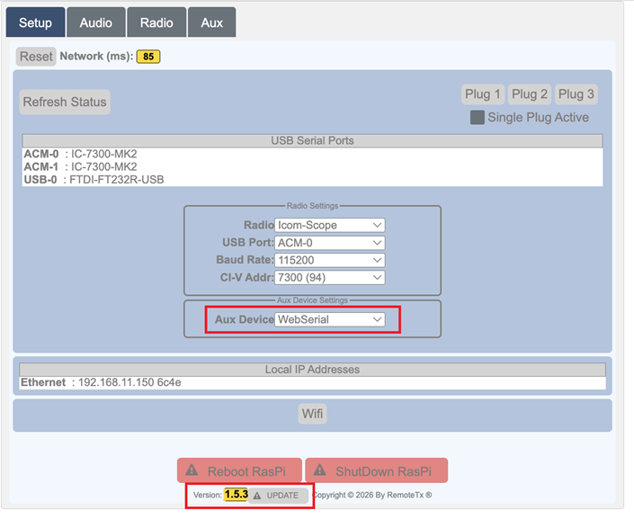 - Make sure that the Version of RemoteTx is set to 1.5.3 or later. Click Update button and a reboot, will bring it to the latest.